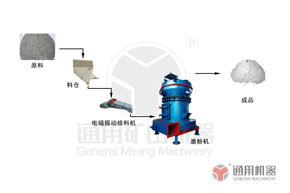 物料由鏟車進(jìn)料到原料倉(cāng),原料倉(cāng)的料再由下端的自動(dòng)給料機(jī),輸送至YGM85主機(jī)進(jìn)行粉磨,成品由集粉器送至打包機(jī)打包。
